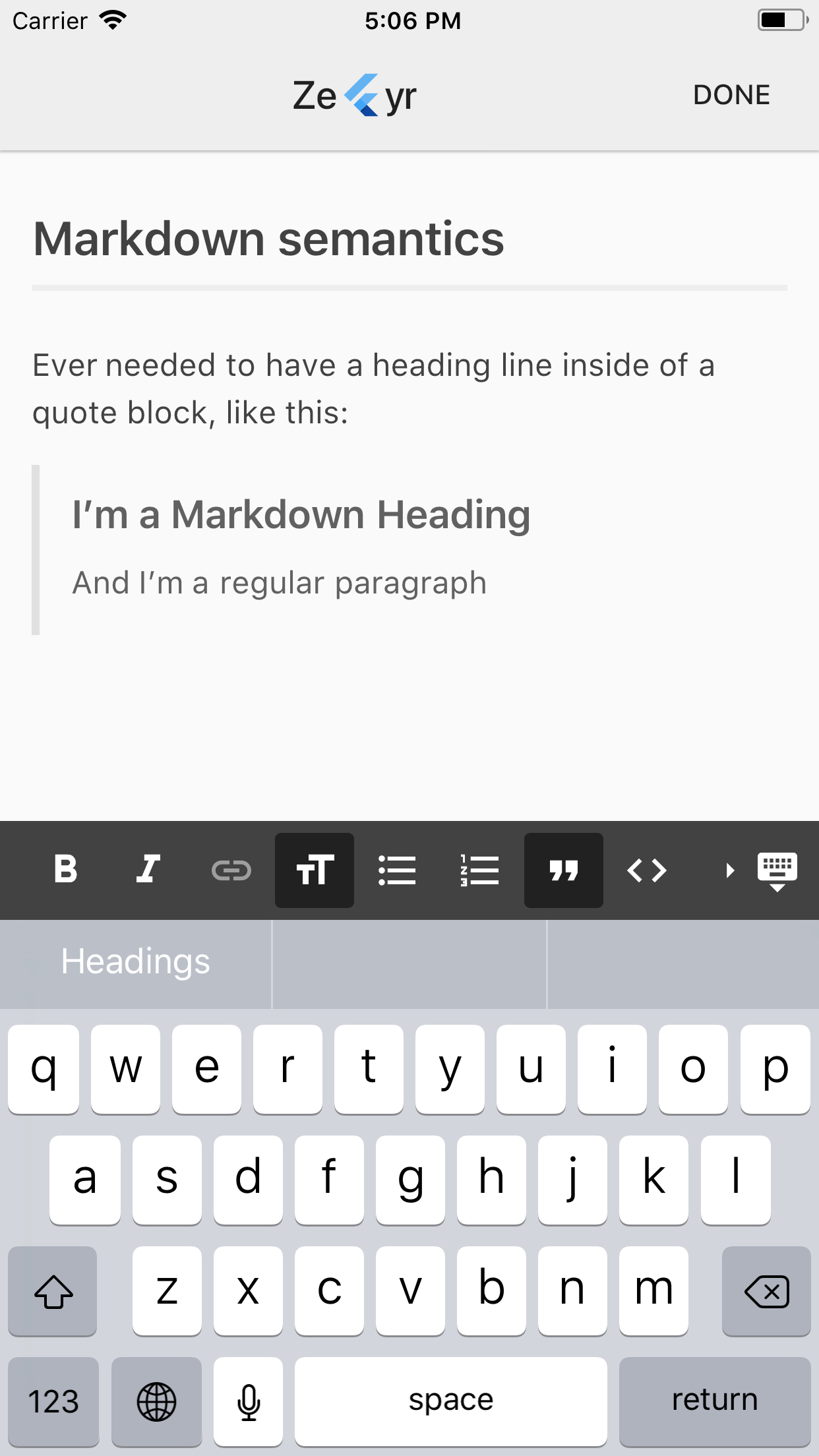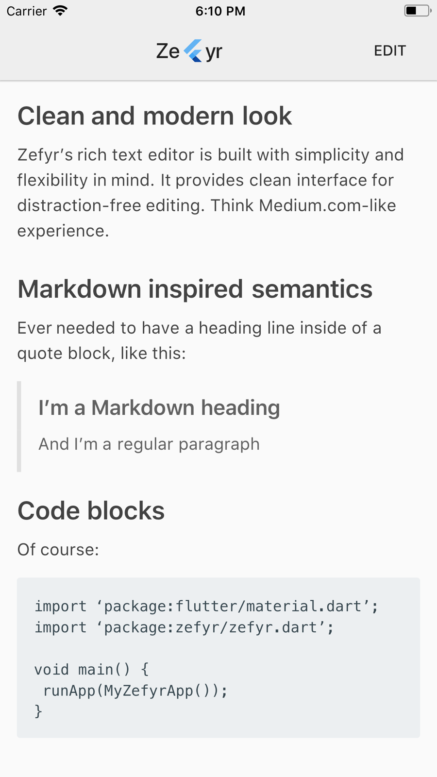 Zefyr's rich text editor is built with simplicity and flexibility in mind. It provides clean interface for distraction-free editing. Think Medium.com-like experience.